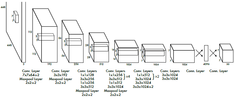 YOLO는 위와 같은 아키텍쳐로 이루어져 있는데, 처음의 20개의 Conv layer와 Avg pool, FC를 연결해 ImageNet에 대해 사전학습시켜 88%의 top-5 정확도를 달성했다. 그 다음, detection 작업을 수행할 수 있도록 4개의 Conv layer와 2개의 FC를 추가한 후 입력크기를 에서 로 늘렸다. 최종 레이어를 제외한 모든 레이어의 활성화 함수는 Leaky ReLU를 사용했다. ()