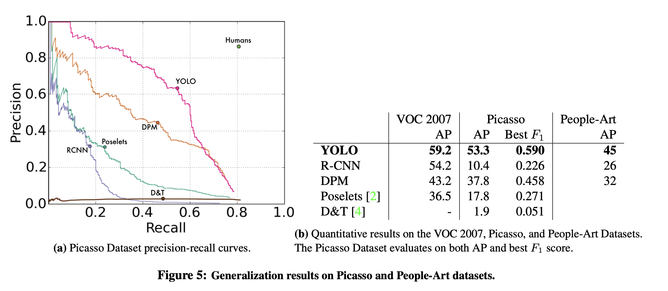 YOLO는 일반적인 이미지로 학습을 시킨 다음 예술 데이터셋에 대해 테스트를 시켰을때 다른 모델보다 뛰어난 일반화 성능을 보여준다